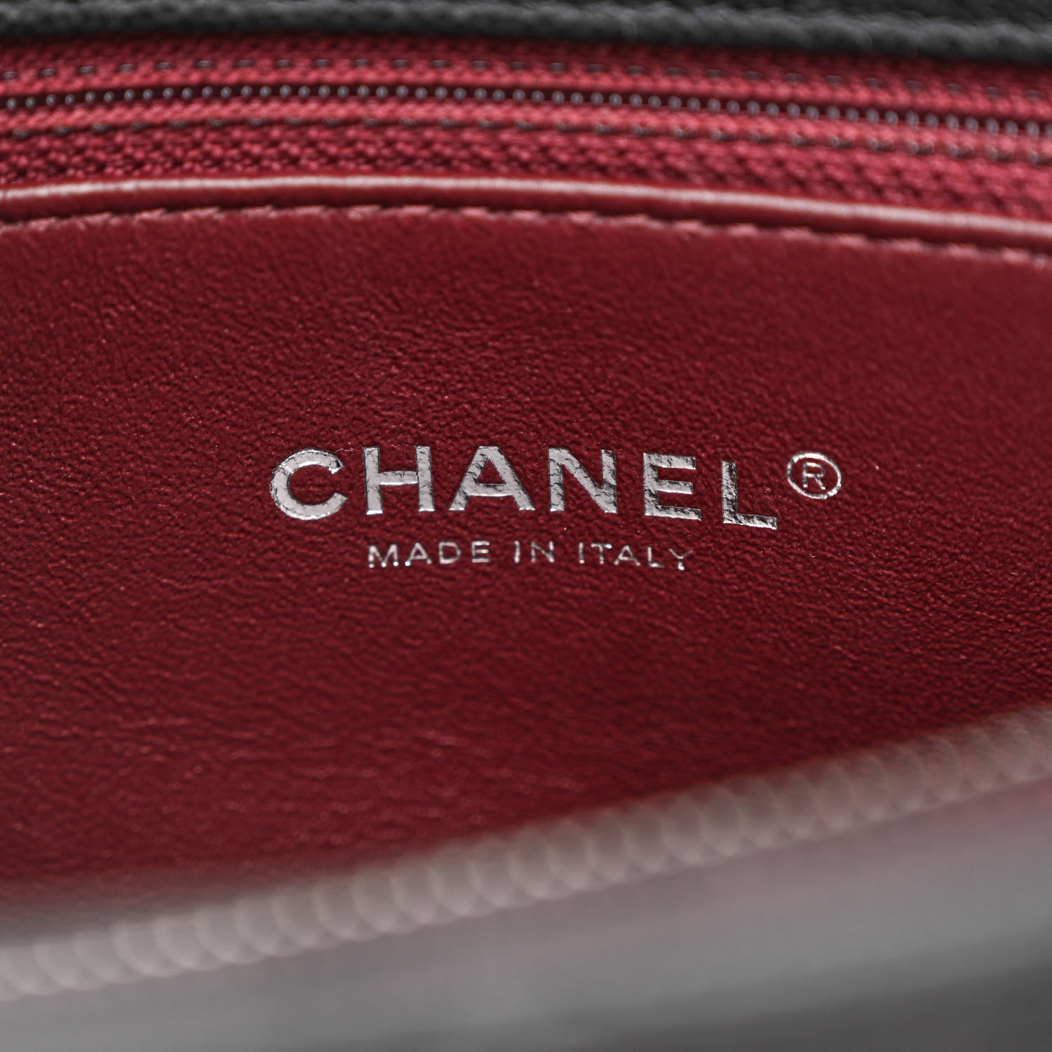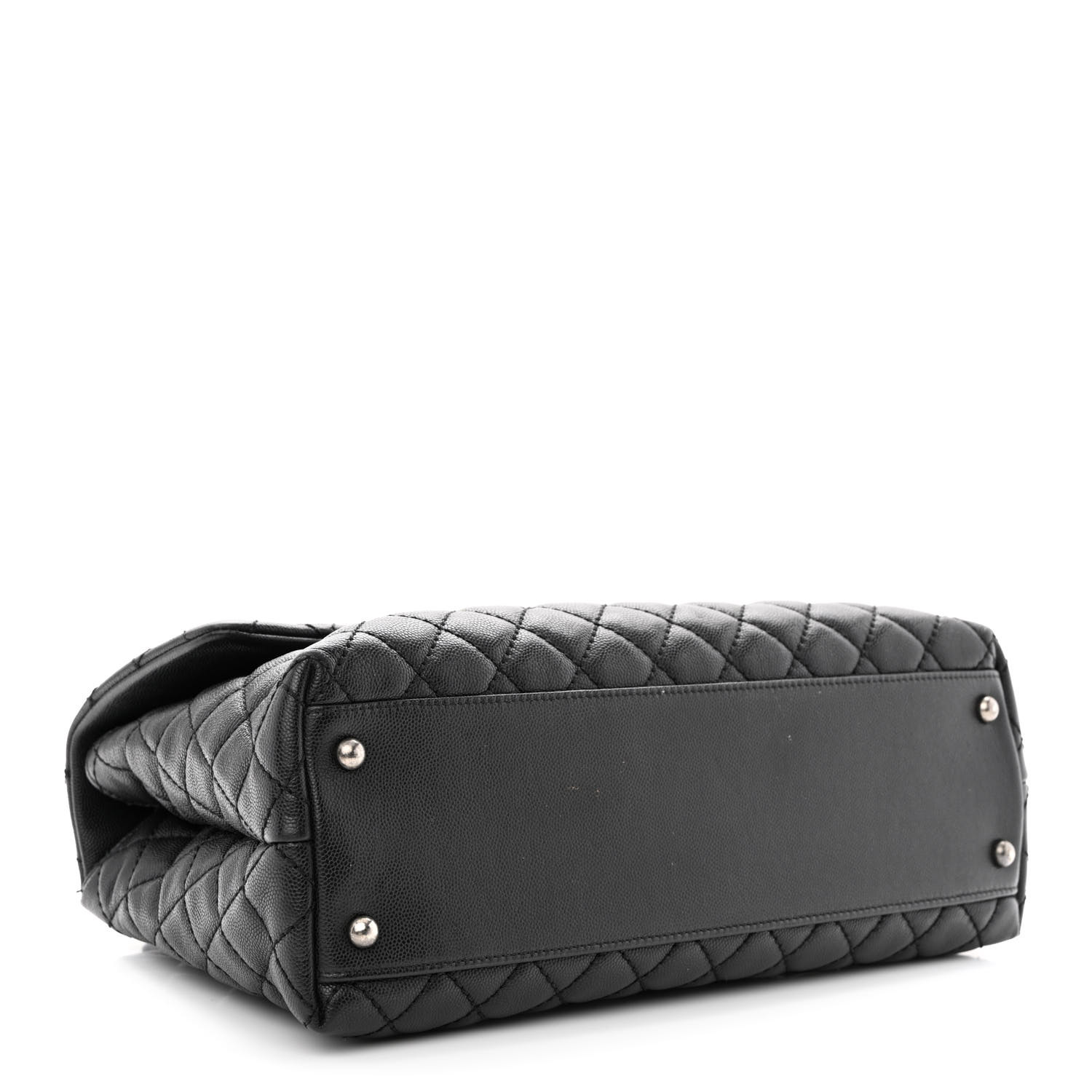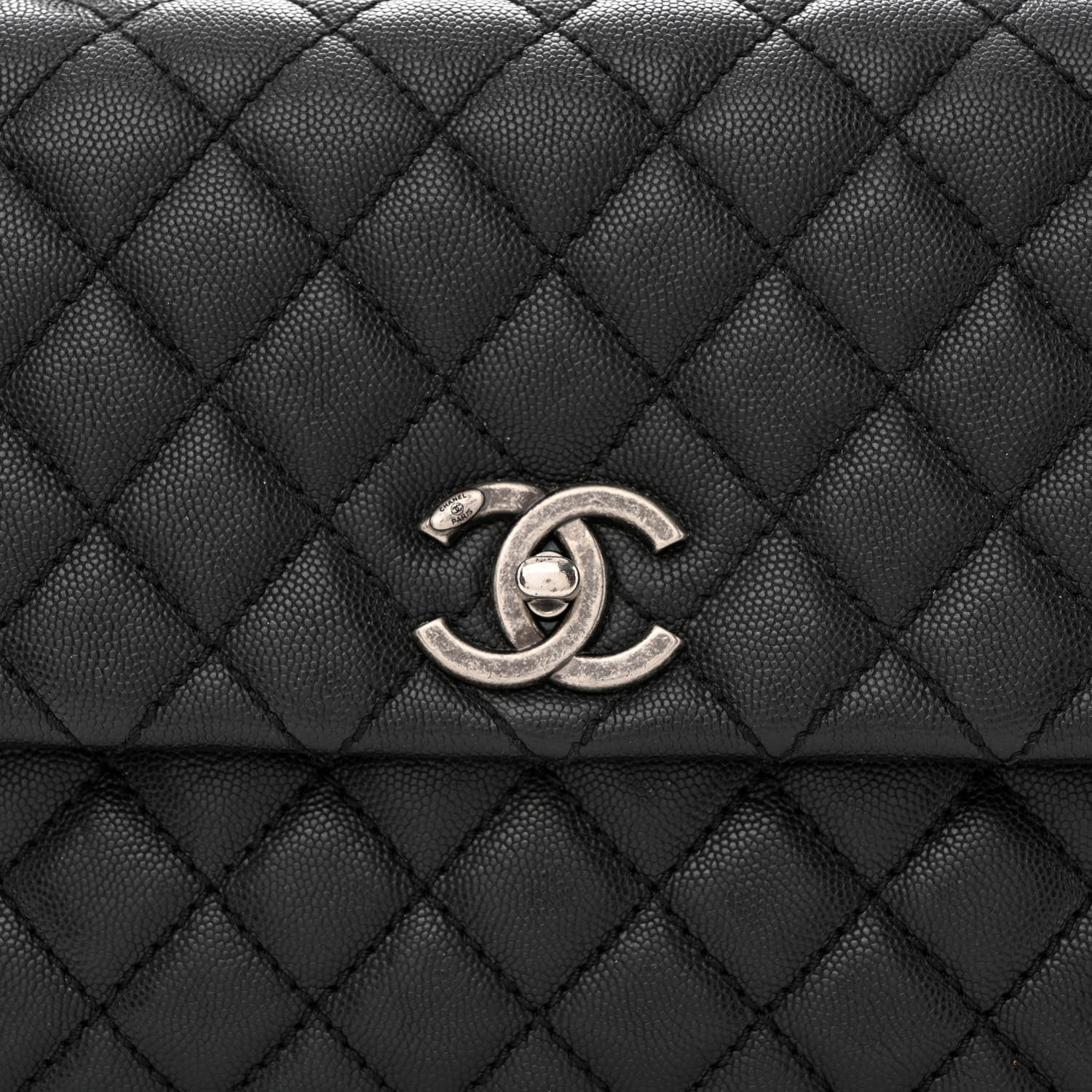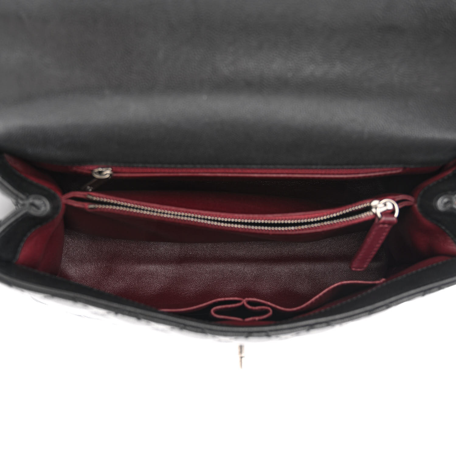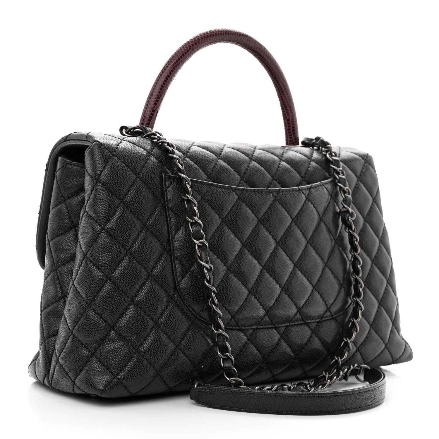 This is an authentic CHANEL Caviar Lizard Quilted Medium Coco Handle Flap in Black. This sleek tote is crafted of diamond quilted caviar leather in black. The shoulder bag features a burgundy rolled lizard embossed leather top handle, a leather threaded ruthenium shoulder strap with a shoulder pad and a CC turn-lock closure. This opens the flap to a partitioned burgundy leather interior with a central zipper compartment.