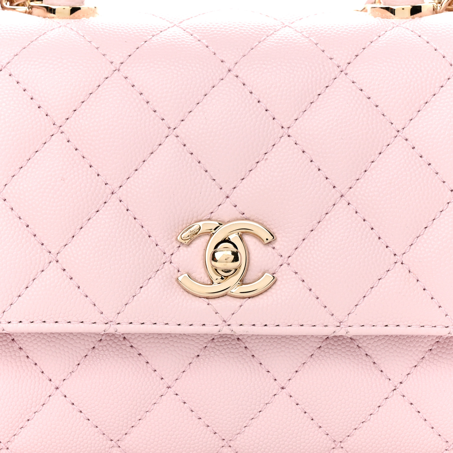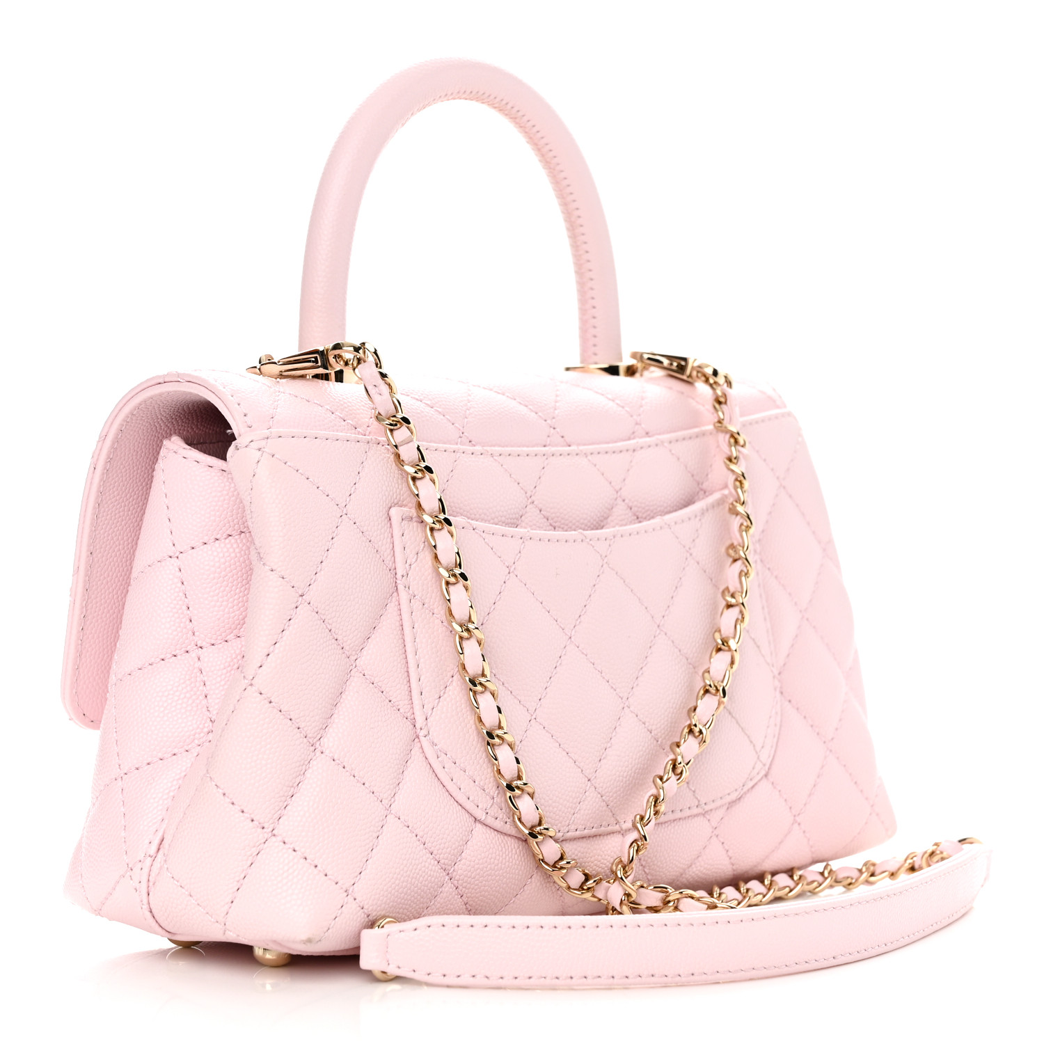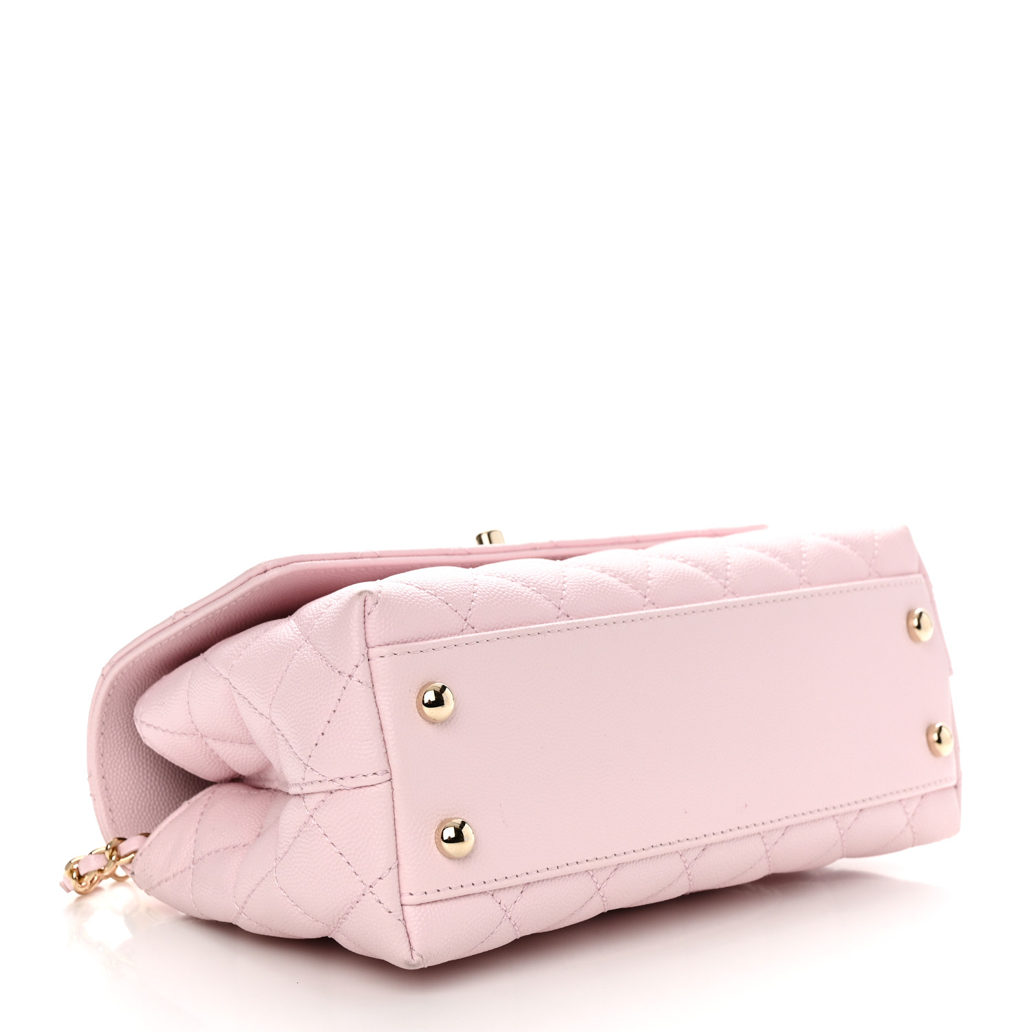 This is a Chanel Caviar Quilted Cocoa Tote in light pink. This tote bag is made of pink caviar grained leather with diamond stitching. This shoulder bag features top handles, a light gold leather cord chain shoulder strap and a CC turnlock closure. The flap opens to a divided pink leather interior pocket with a zip pocket.