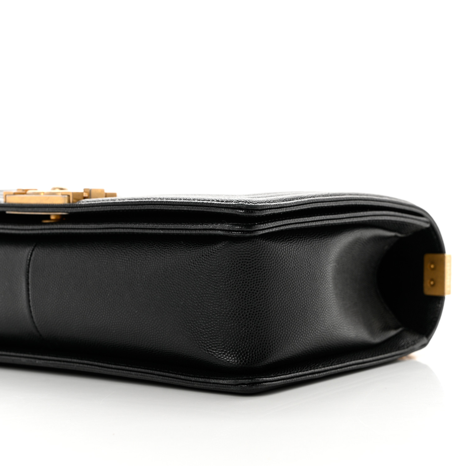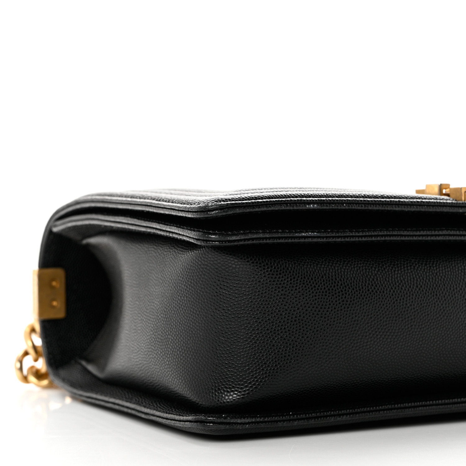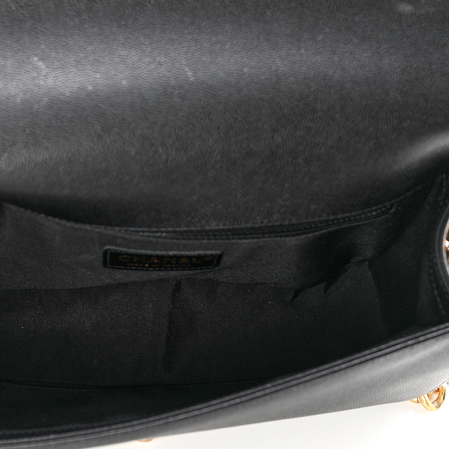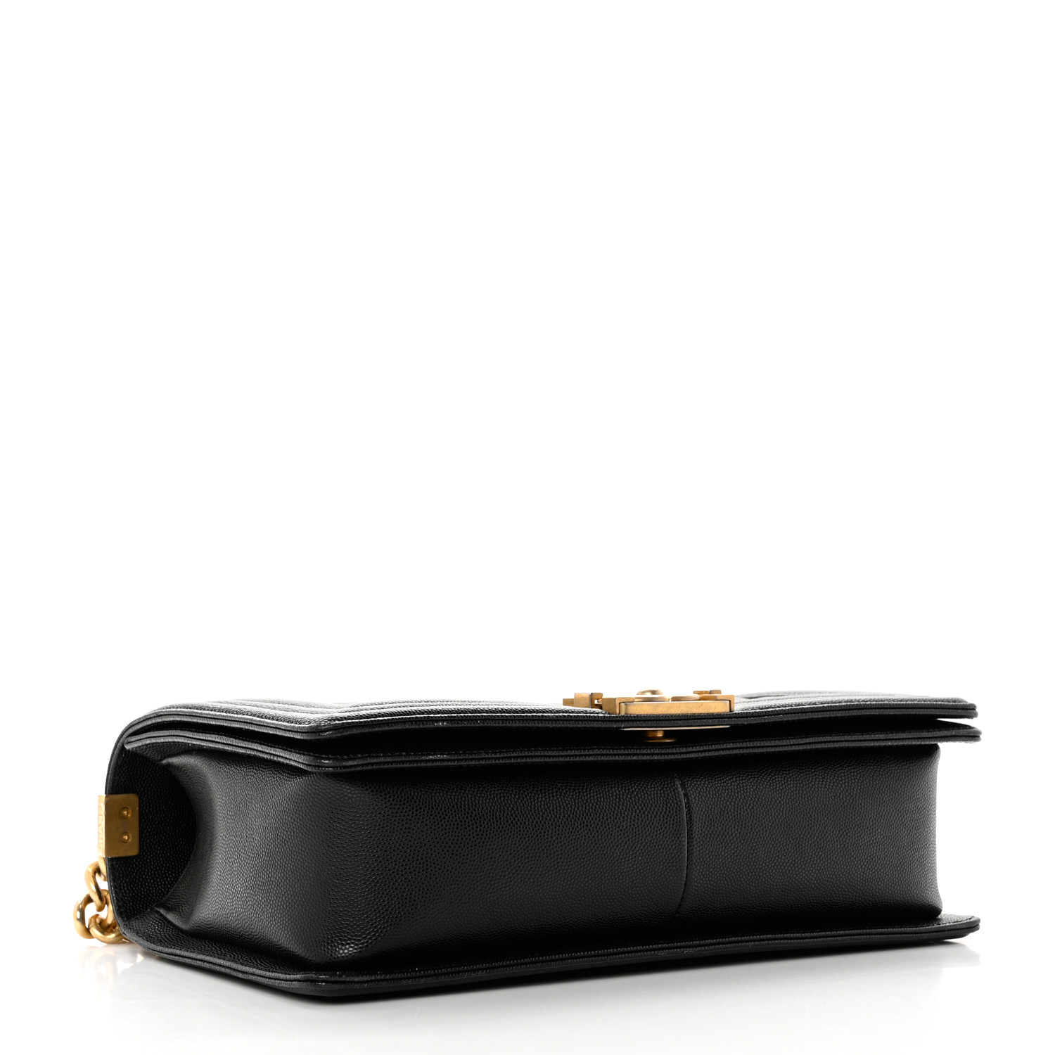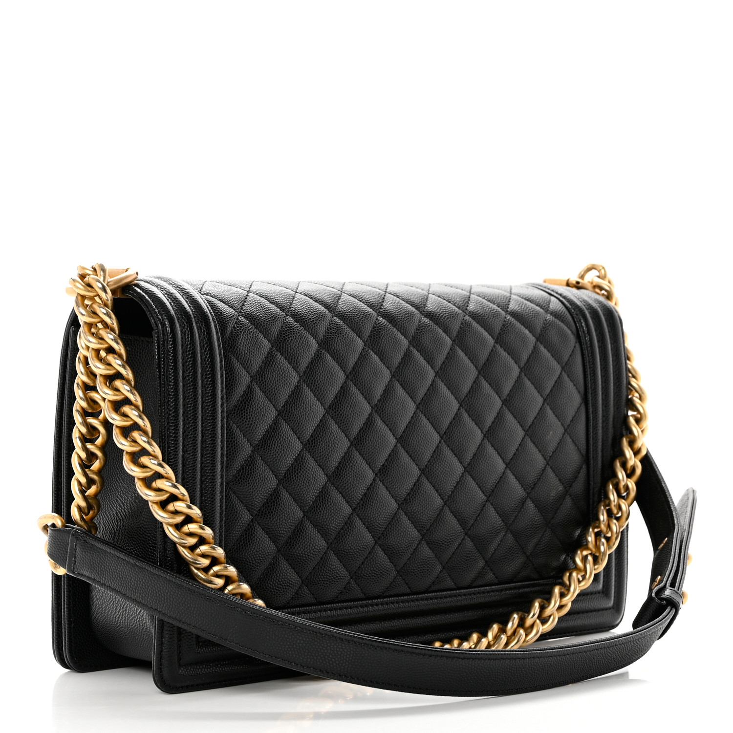 This is an authentic CHANEL Cav CHANEL Caviar Quilted Medium Boy Flap in Black. This stylish shoulder bag is crafted of diamond quilted caviar leather with linear quilted borders in black. The bag features an aged gold chain link shoulder strap with a leather shoulder pad and a Chanel boy CC push lock. This opens the full flap to a black fabric interior with zipper and patch pockets.