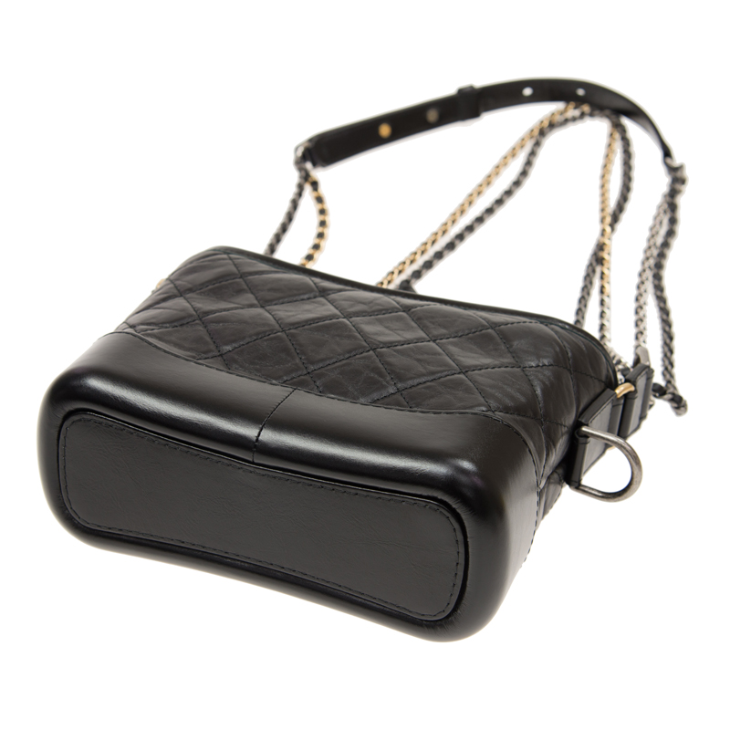 This is an authentic CHANEL Aged Calfskin Quilted Small Gabrielle Hobo in Black. This chic shoulder bag is crafted of diamond-stitched aged calfskin leather in black. it features a sturdy smooth black calfskin base, and thin gold-tone and ruthenium chain link leather threaded shoulder straps with a shoulder pad. The top zipper features an aged gold Chanel CC zipper pull and opens to a spacious red fabric interior with zipper and patch pockets.