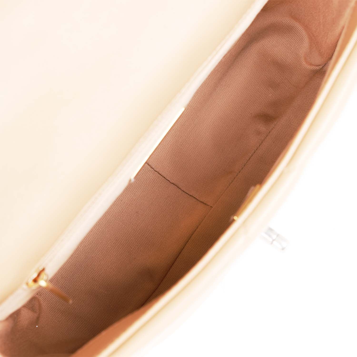 This Medium 19 Flap bag is of Beige calfskin with mixed metal hardware and has the signature diamond quilting, signature CC interlocking closure, exterior back pocket, chain top handle, and long mixed metal and beige leather chain.