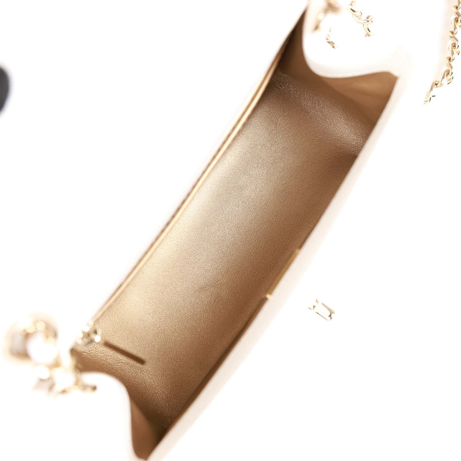 This Pearl Crush Mini Square flap bag is of white lambskin with light gold tone hardware and has a front flap with signature CC turnlock closure, rear half moon pocket, single interwoven white leather and light gold tone chain link shoulder/crossbody strap with adjustable "pearl" ball.