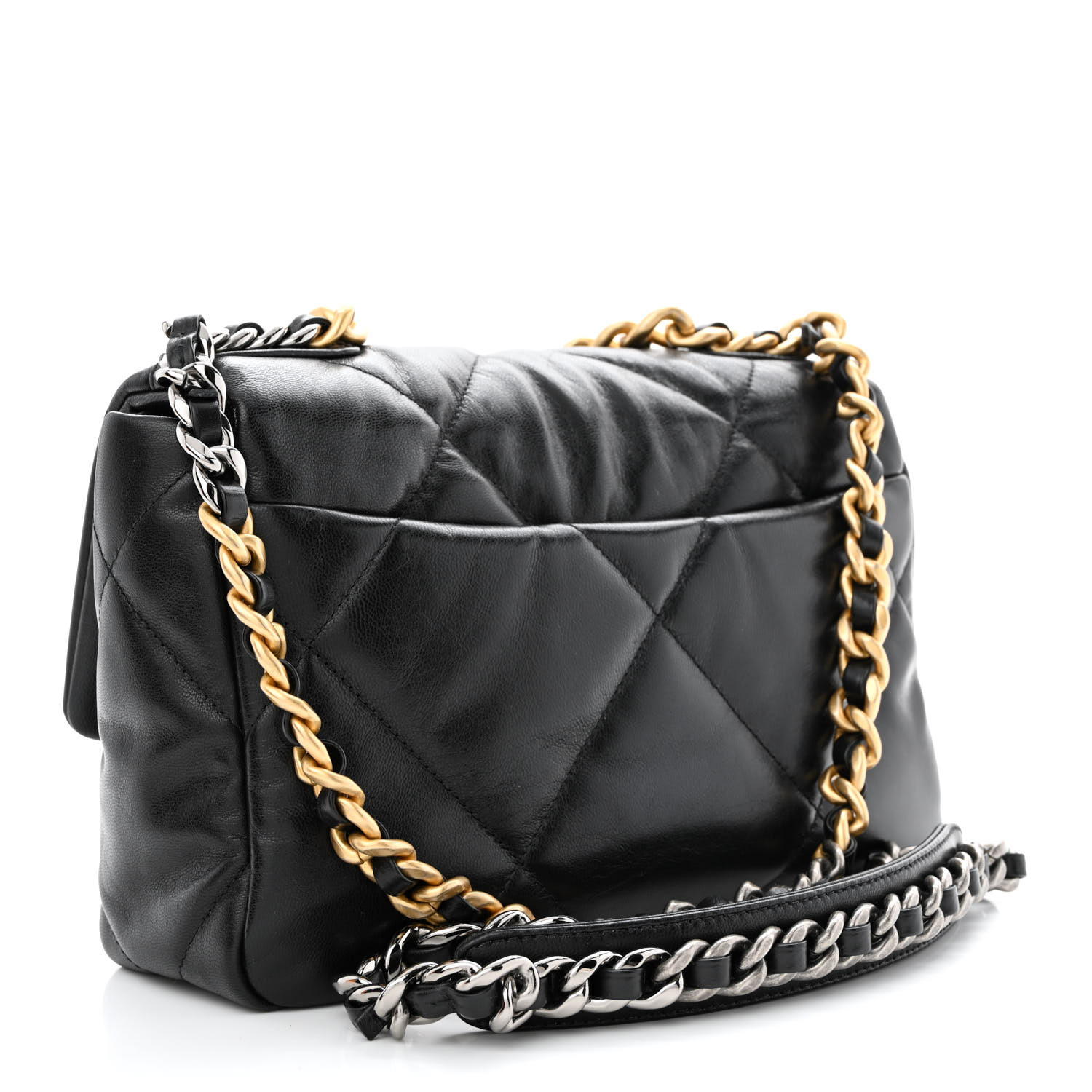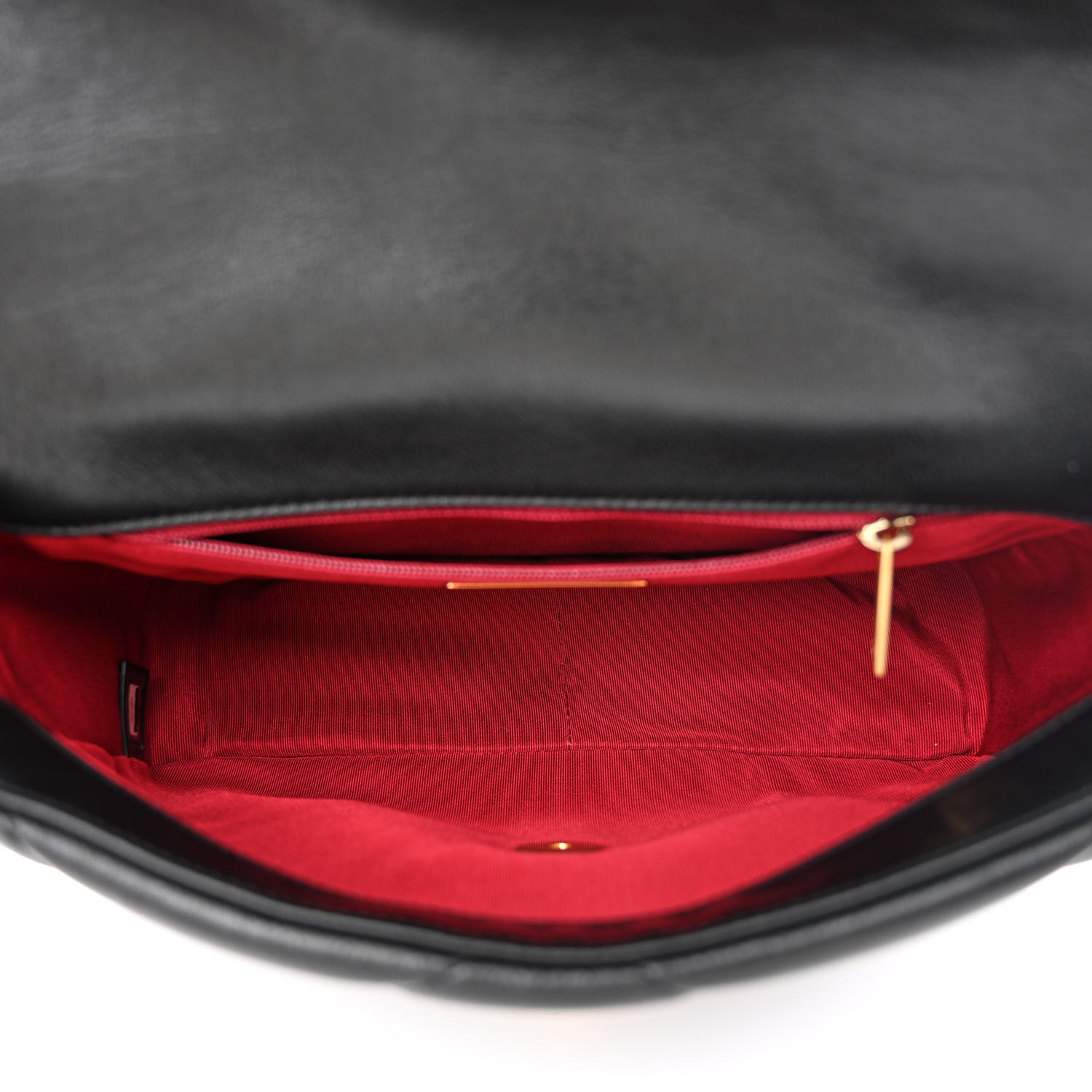 This is an authentic CHANEL Shiny Goatskin Quilted Medium Chanel 19 Flap in Black. This pillowy soft shoulder bag is crafted of oversized quilted goatskin leather in black. The refined bag features a chain detail CC turn-lock on the flap, a magnetic snap pocket at the rear, and a leather threaded aged gold, ruthenium, and dark silver chain-link shoulder strap with a leather shoulder pad. The front flap opens to a red fabric interior with a zipper pocket.