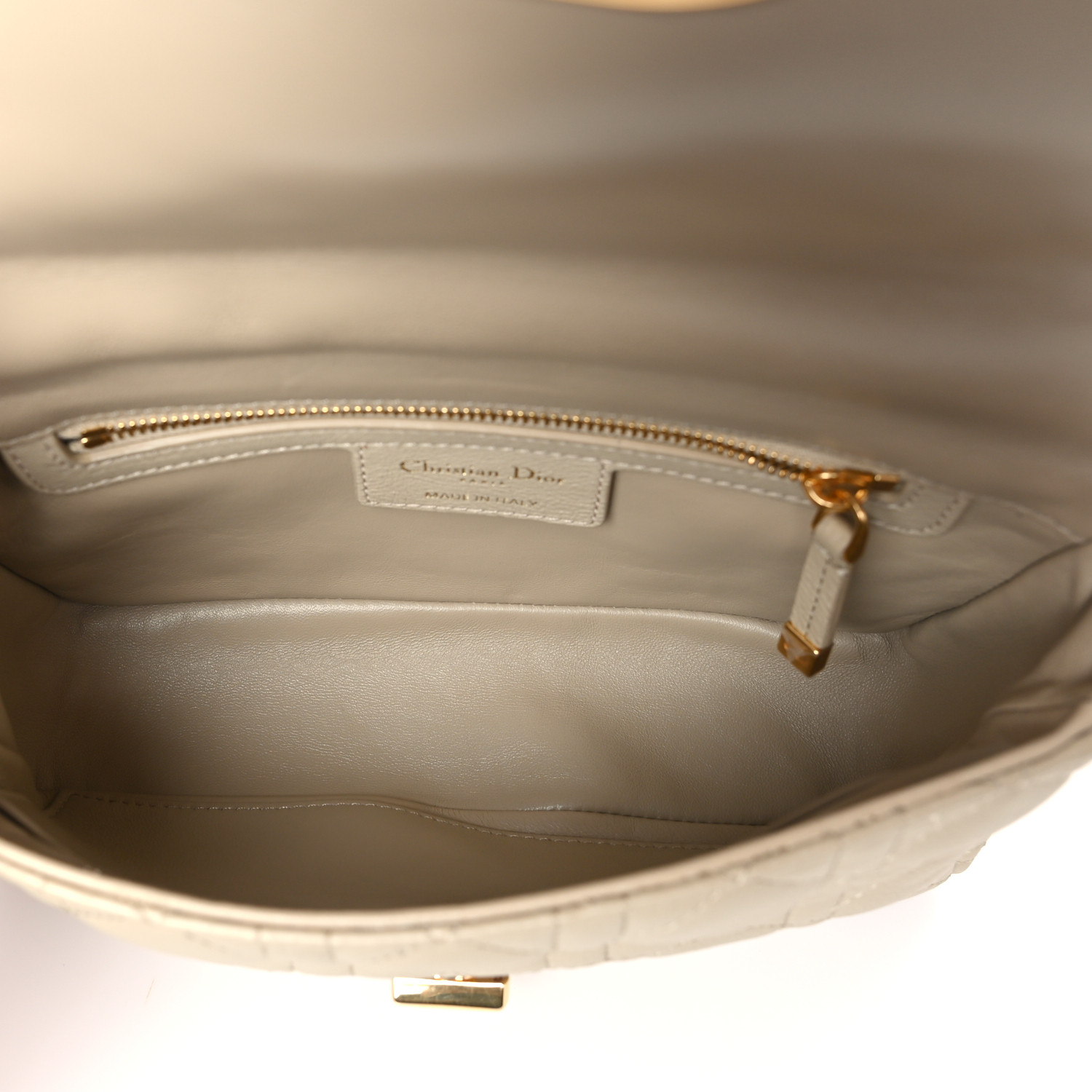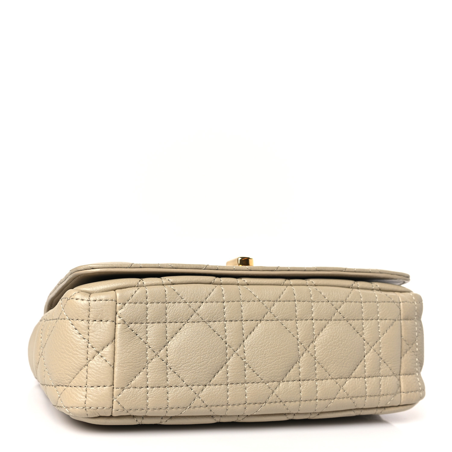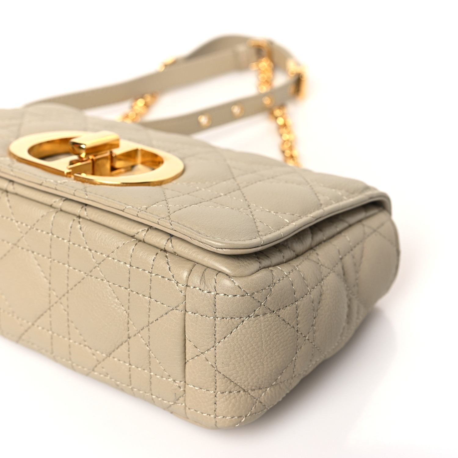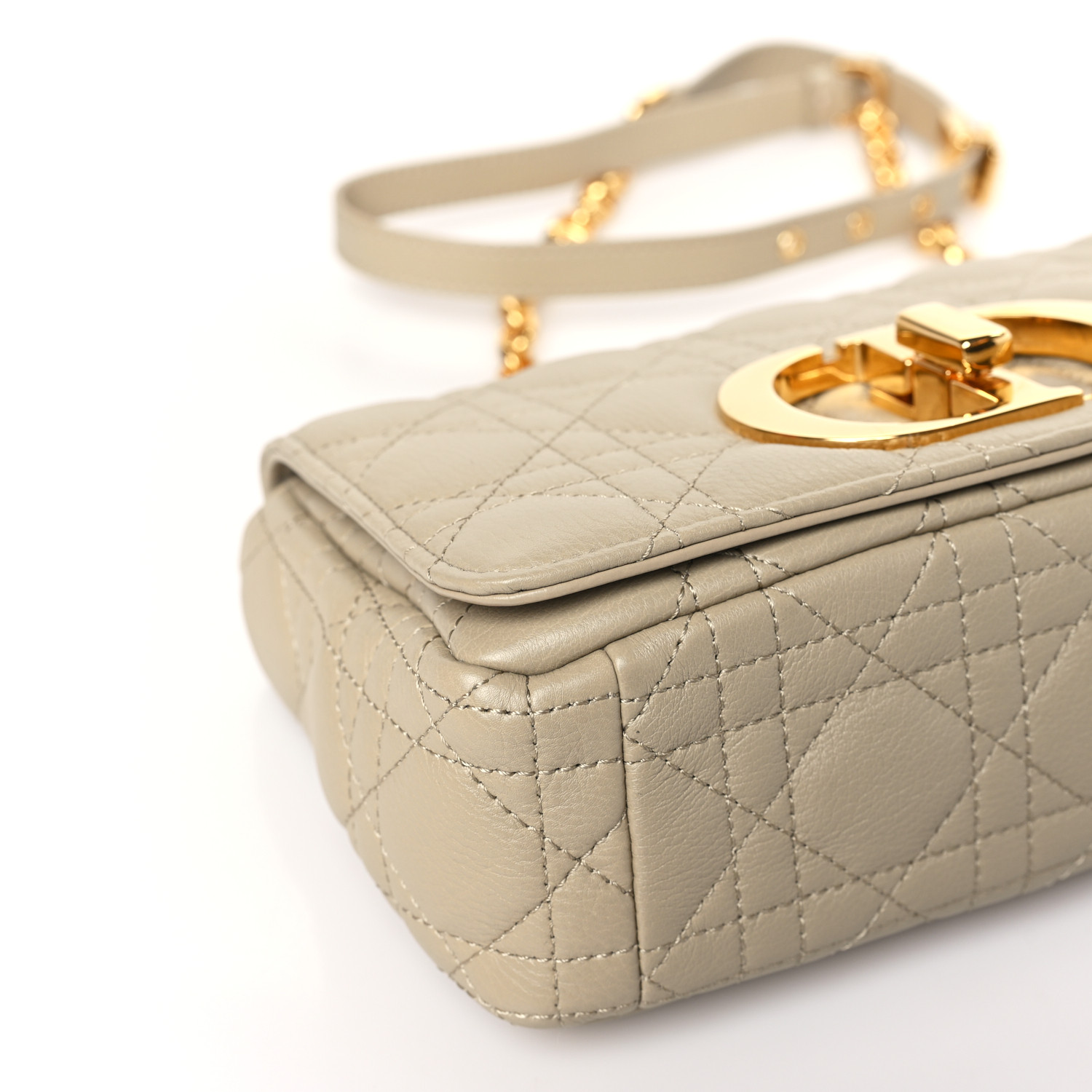 This is an authentic CHRISTIAN DIOR Calfskin Cannage Small Caro Bag in Beige. This flap bag is finely crafted of diamond quilted calfskin leather in beige. The bag features a gold chain and leather shoulder strap and a gold turn lock. This opens to a matching leather interior with zipper and patch pockets.