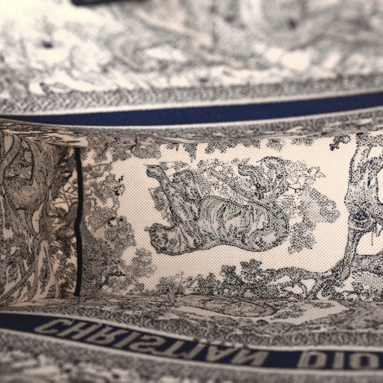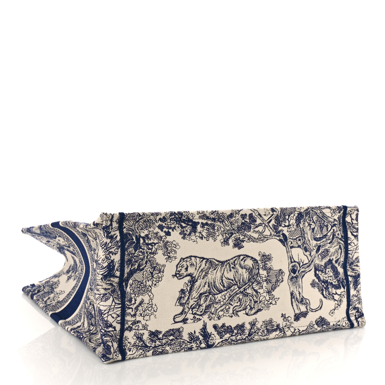 This is an authentic CHRISTIAN DIOR Canvas Embroidered Large Dioriviera Toile De Jouy Book Tote in Blue. This colorful tote is finely crafted of embroidered canvas with a bold jungle graphic in dark blue. The bag features matching canvas rolled handles, with the CHRISTIAN DIOR logo embroidered across the front.