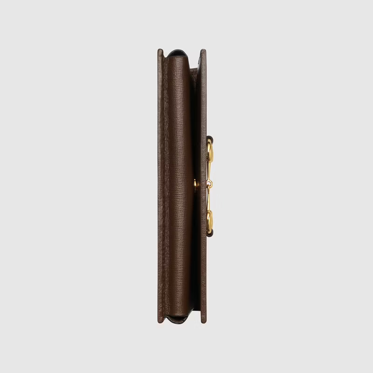 The chain wallet in GG Supreme canvas and leather is introduced as part of the Gucci Horsebit 1955 accessories collection, defined by the double ring and bar design also found in Handbags. The folded snap-closure shape features several card slots and pockets, completed with a detachable chain strap.
