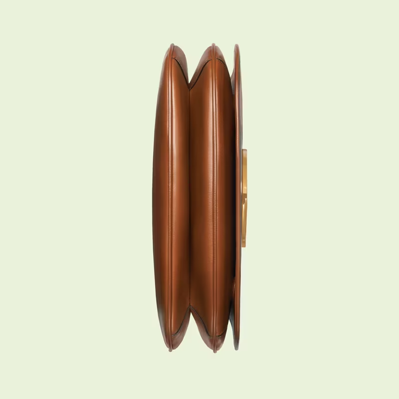 Coming from the House's archives, a geometrically shaped version of the Interlocking G logo is reintroduced for Gucci Love Parade. The emblem enriches the design with a timeless feel鈥攎irroring the Hollywood glamour that shaped the fashion show. This medium-sized version of the accessory is presented in brown leather.