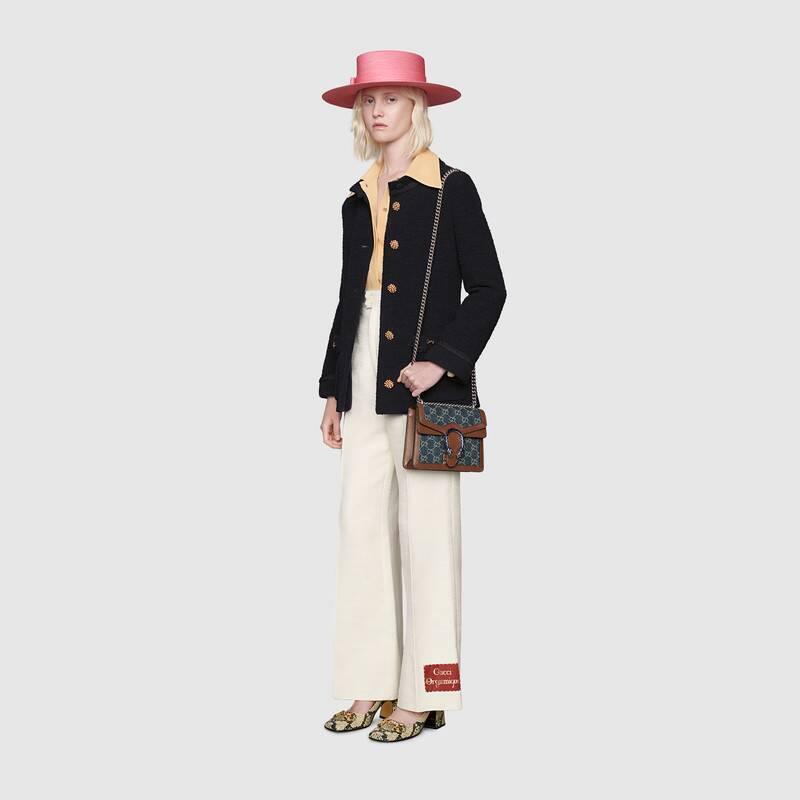 The Dionysus mini bag, crafted in Double G jacquard eco-wash denim, is a powerful addition to the Epilogue collection. The handbag continues the brand's design concept of using new methods to interpret classic elements, cleverly incorporating bright blue enamel details in the collection's iconic tiger head lock, which contrasts with the dark tones of the denim fabric. Contrasting-tone leather piping adds glamour to the overall design.