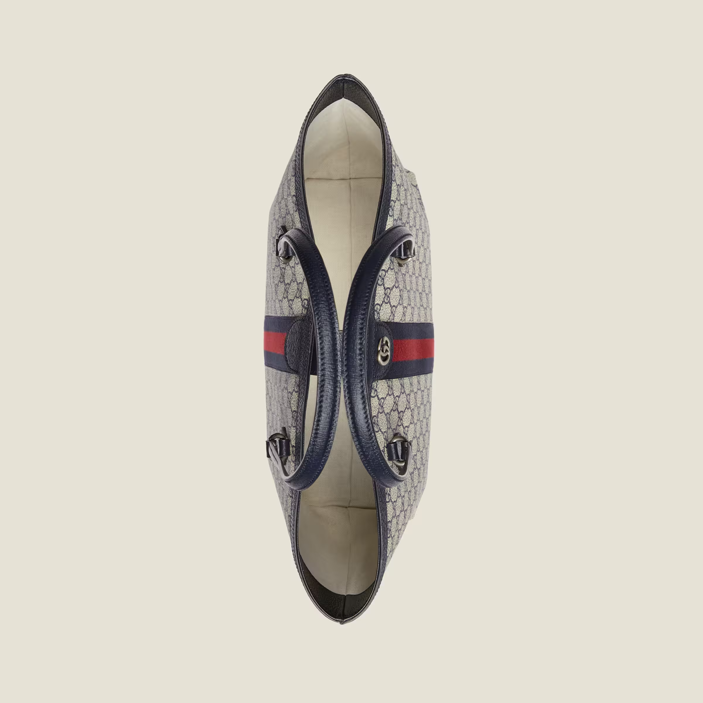 Mirroring the material's historic origins, GG Supreme is introduced in a timeless mix of blue and beige for Gucci Love Parade. The canvas has come to the front of each collection decade after decade to become a hallmark of the House. Here, the classic palette defines this medium-sized Ophidia tote bag, completed by the Web stripe in red and blue.