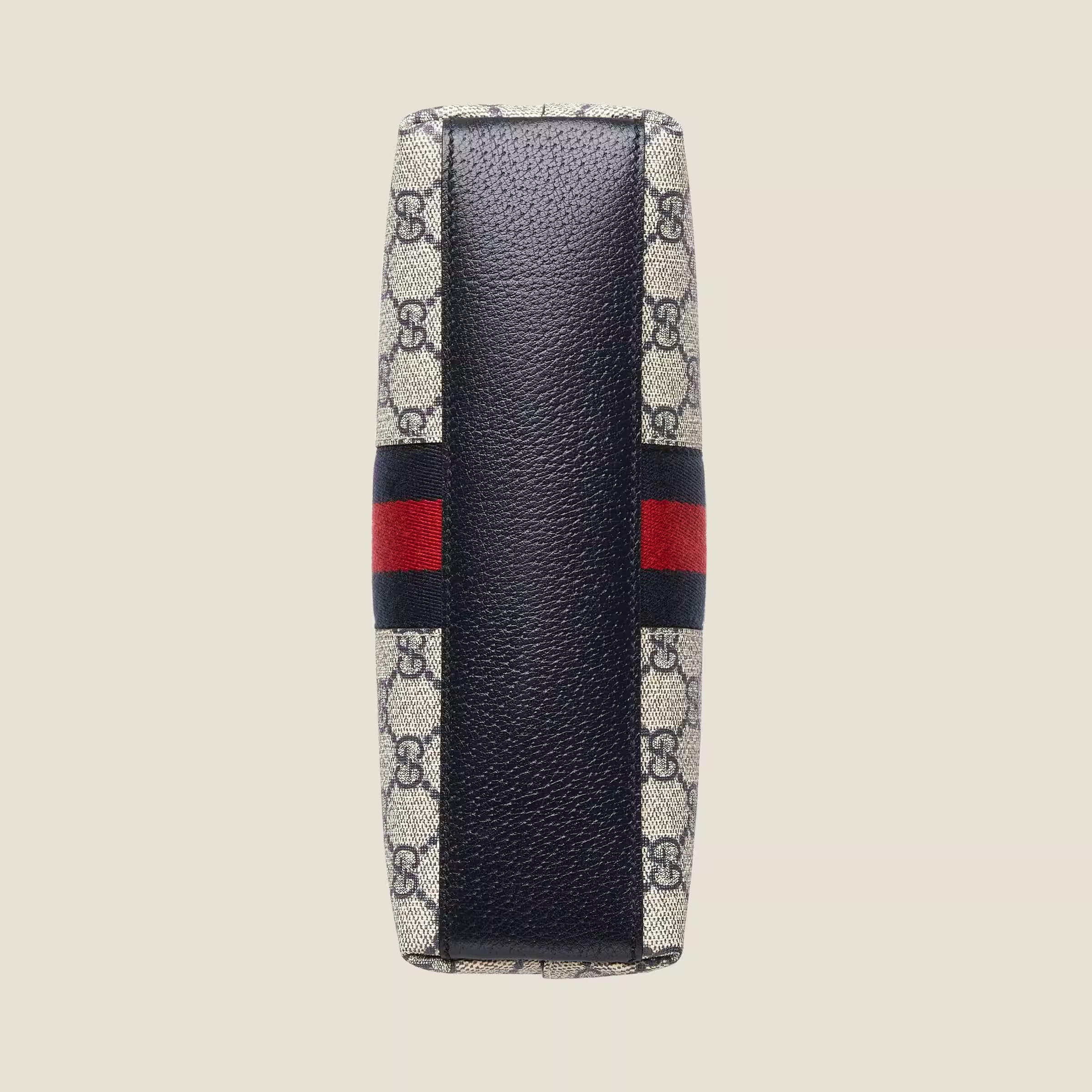 Mirroring the material's historic origins, GG Supreme is introduced in a timeless mix of blue and beige for Gucci Love Parade. The canvas has come to the front of each collection decade after decade to become a hallmark of the House. Here, the classic palette defines this small Ophidia shoulder bag.