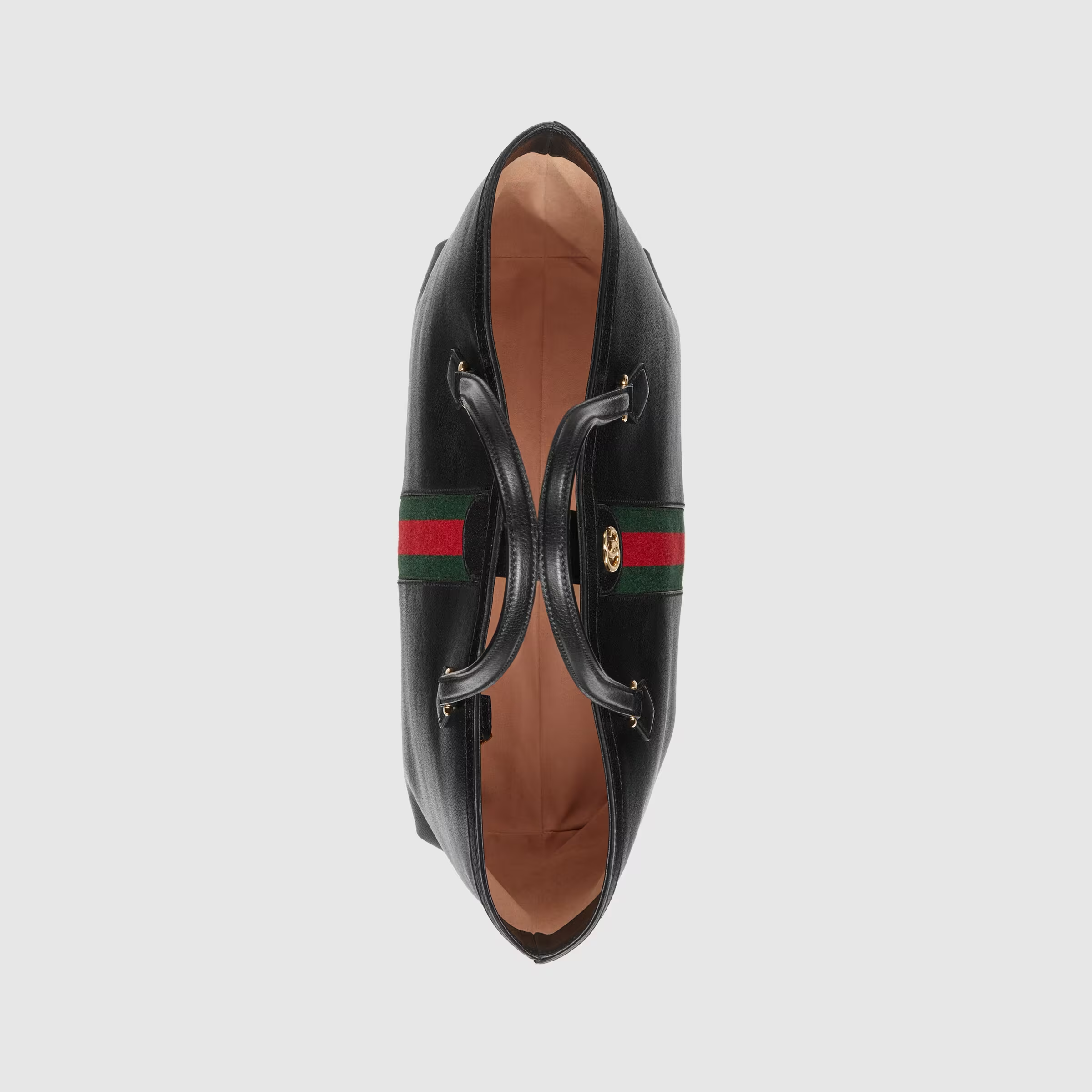 Enriched with vintage details, the world of Ophidia expands with the introduction of a black leather tote. With a softly structured silhouette, the bag pairs two archival details as a tribute to the origins of the House. The Double G is a reference to Guccio Gucci's monogram while the green and red Web stripe is a celebration of the brand's equestrian roots.