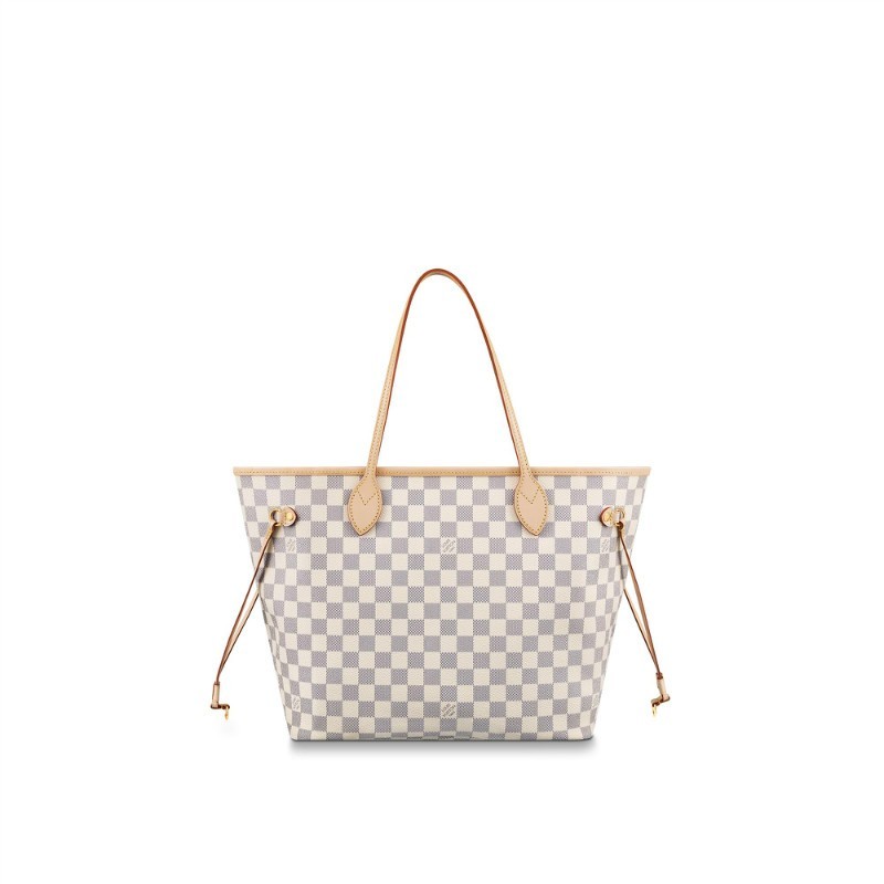 The Neverfull MM tote unites timeless design with heritage details. Made from fresh Damier Azur canvas with natural cowhide trim, it is roomy yet not bulky, with side laces that cinch for a sleek allure or loosen for a casual look. The slim leather handles slip easily over the shoulder or arm. Lined in colorful textile, it features a removable pouch which can be used as a clutch or an extra pocket.