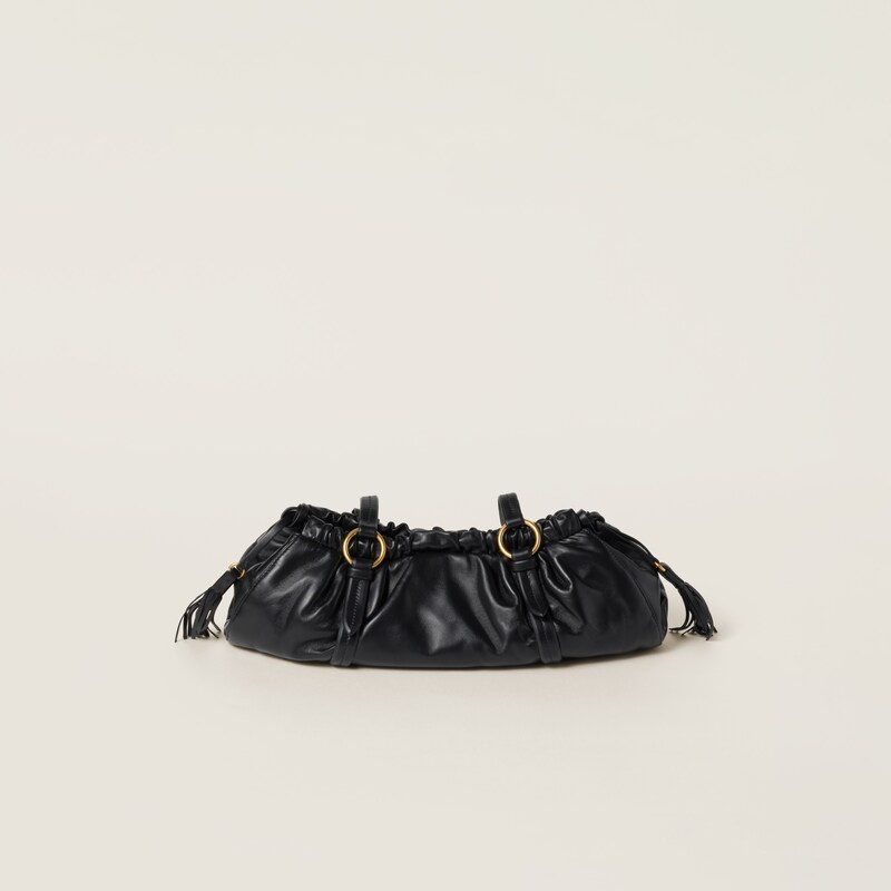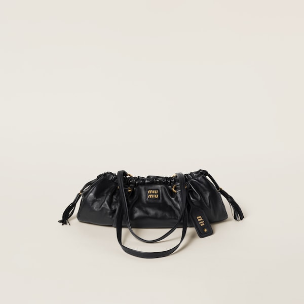 The Joie nappa leather bag, a style recovered from the Miu Miu archives, is reinterpreted in terms of its light, casual, and compact structure and attitude, creating a bag with timeless charm. The leather trick adds a refined detail while the lettering logo in relief completes the design with an iconic note.