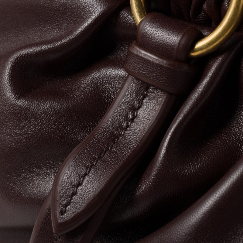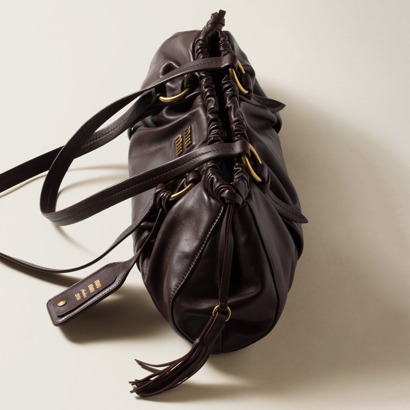 The Joie nappa leather bag, a style recovered from the Miu Miu archives, is reinterpreted in terms of its light, casual, and compact structure and attitude, creating a bag with timeless charm. The leather trick adds a refined detail while the lettering logo in relief completes the design with an iconic note.