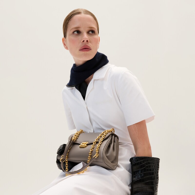 The classic design of this shoulder bag is given a contemporary twist thanks to the gold-tone metal lettering logo and the distinctive, slightly padded leather. The elegant front flap and adjustable shoulder strap underline the versatility and research of the finest materials.