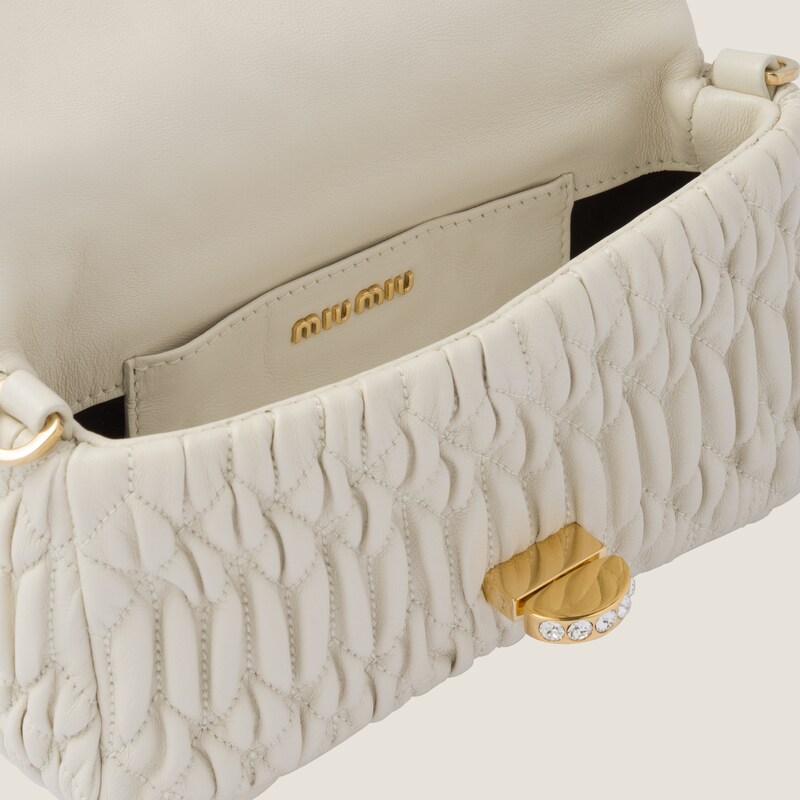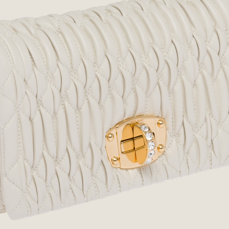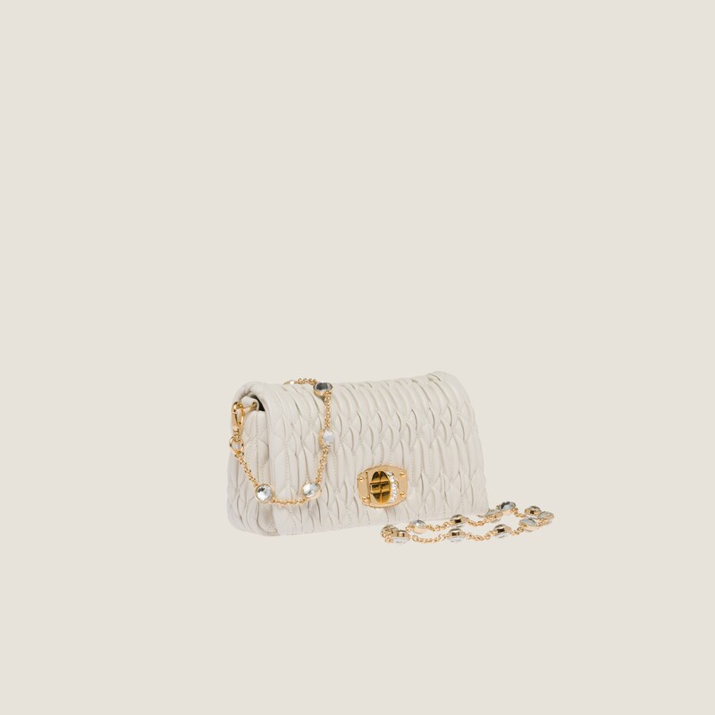 Sparkling crystals embellish the chain shoulder strap and define the sophisticated design of the Miu Crystal nappa leather bag. The quilted motif adds an iconic note to the bag.