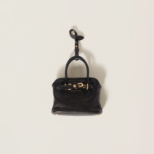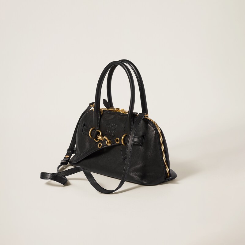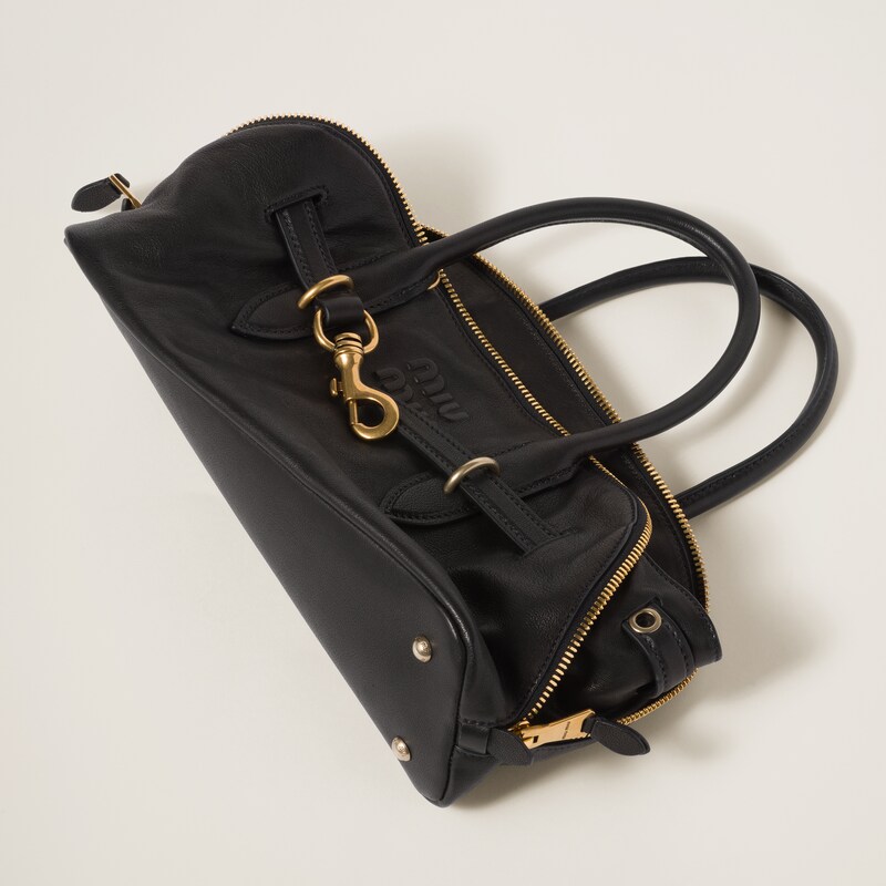 The Aventure top-handle bag, recovered from the Miu Miu archives, has been reinterpreted in terms of a lighter structure and attitude, creating a classic style with timeless charm. The embossed lettering logo completes the design with an iconic note.