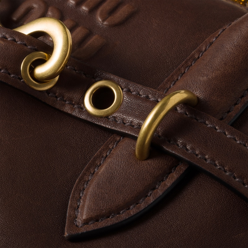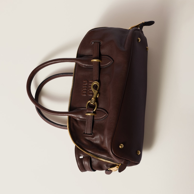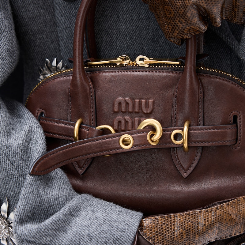 The Aventure top-handle bag, recovered from the Miu Miu archives, has been reinterpreted in terms of a lighter structure and attitude, creating a classic style with timeless charm. The embossed lettering logo completes the design with an iconic note.