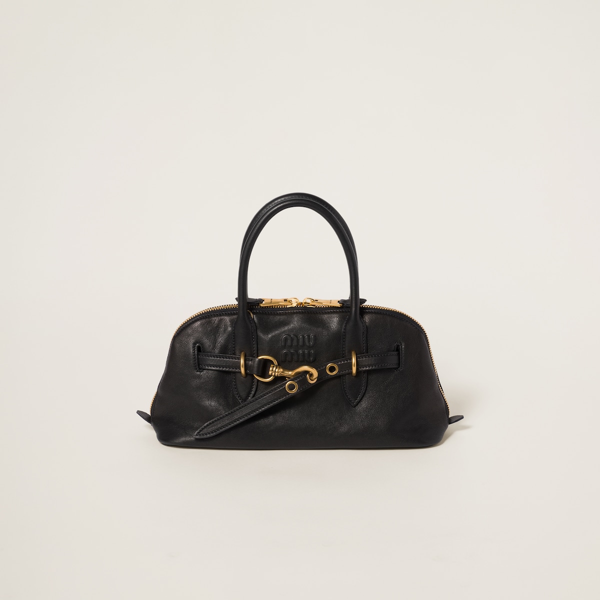 The Aventure top-handle bag, recovered from the Miu Miu archives, has been reinterpreted in terms of a lighter structure and attitude, creating a classic style with timeless charm. The embossed lettering logo completes the design with an iconic note.