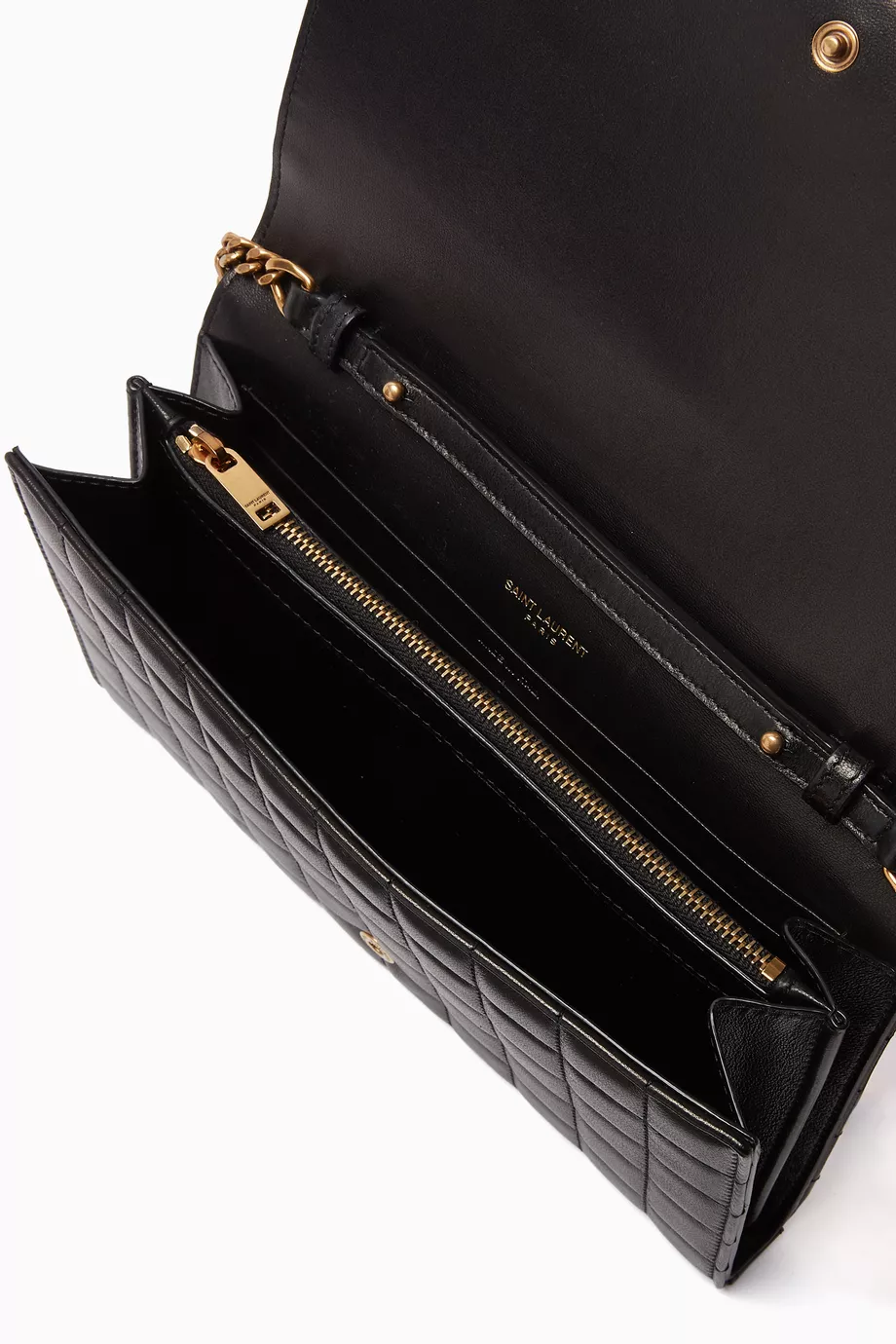 Black ‘Cassandre’ quilted wallet on a chain strap from Saint Laurent. Crafted from leather, this design secures with a snap and features a logo application. It is complete with gold-tone metal hardware and two compartments, ten card slots and one zipped coin pocket.