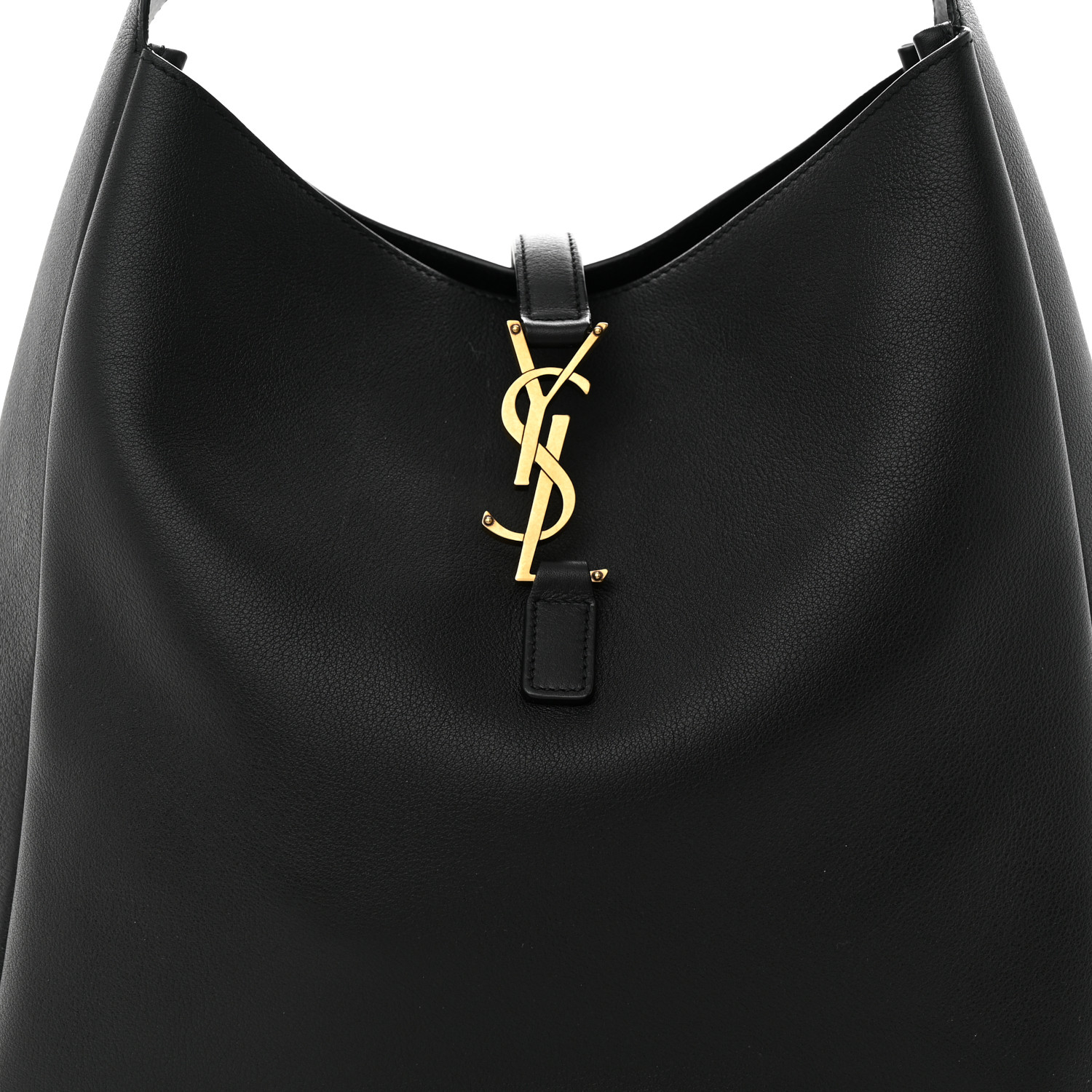 This is an authentic SAINT LAURENT Smooth Calfskin Large Le 5 A 7 Soft Hobo in Black. The hobo bag is classically structured and is crafted of luxurious black leather. It features a looping adjustable shoulder strap and a crossover strap with a gold YSL logo to latch the bag closed. The top of the bag is open to a black suede interior with a zipper pocket that creates a patch pocket.